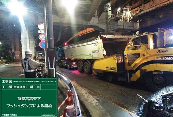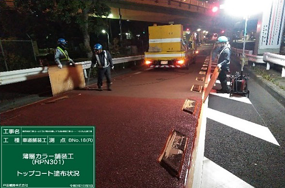 本工事は主要地方道日本橋芝浦大森線(第316号)海岸通りの浜離宮恩賜庭園南側の外堀付近から東京ガス前交差点付近までの施工延長661.23m区間において、切削オーバーレイ(厚10cm)で車道舗装の打換や歩道舗装・縁石等の復旧工事を行いました。