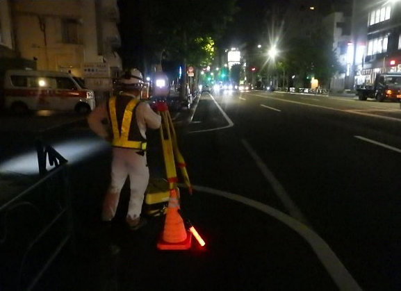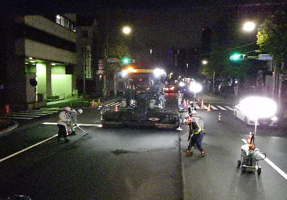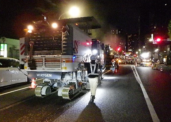 そのため、夜間でも人道りや一般通行車両・出入りする車両が多い区間での施工になり、防塵対策・工事騒音・振動を極力低減しての工事でした。