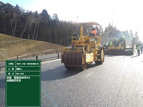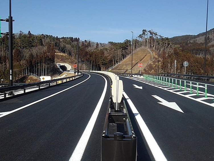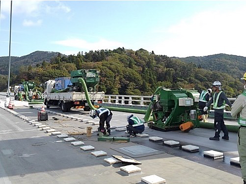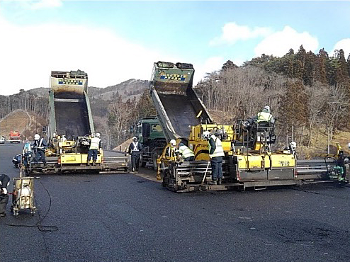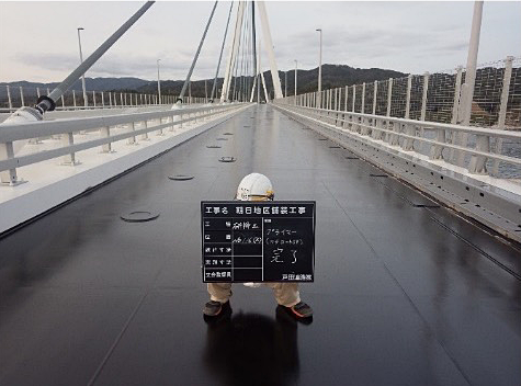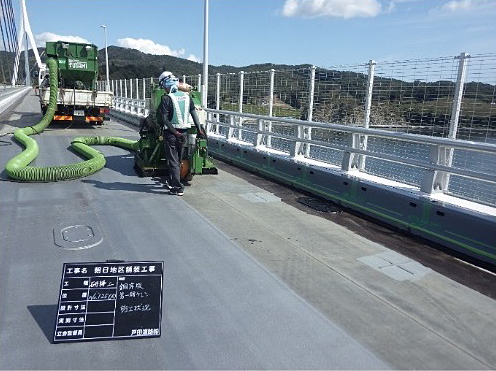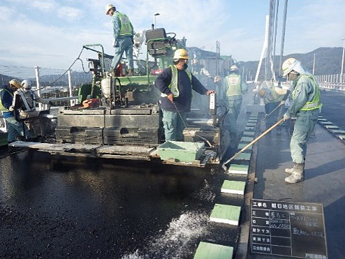 本工事は、三陸沿岸道路「復興道路」の事業として発注されました。斜張橋部は鋼床版を用いられおり、ショットブラストにて鋼床版面の研掃工を施し、基層部には水密性が高く、たわみ追従性に優れたグースアスファルトの施工を行いました。