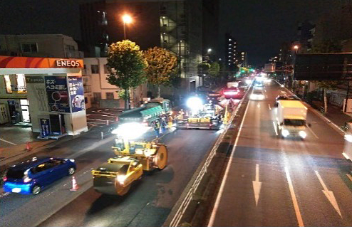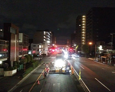 本工事箇所は東京都内でも交通量の多い主要幹線道路の一つである環七上であるため、舗装切断工と区画線工を除いて夜間工事で行いました。