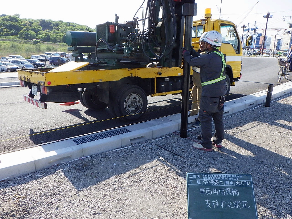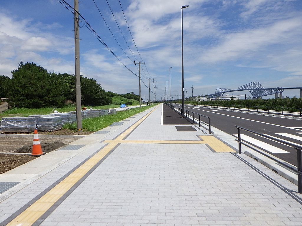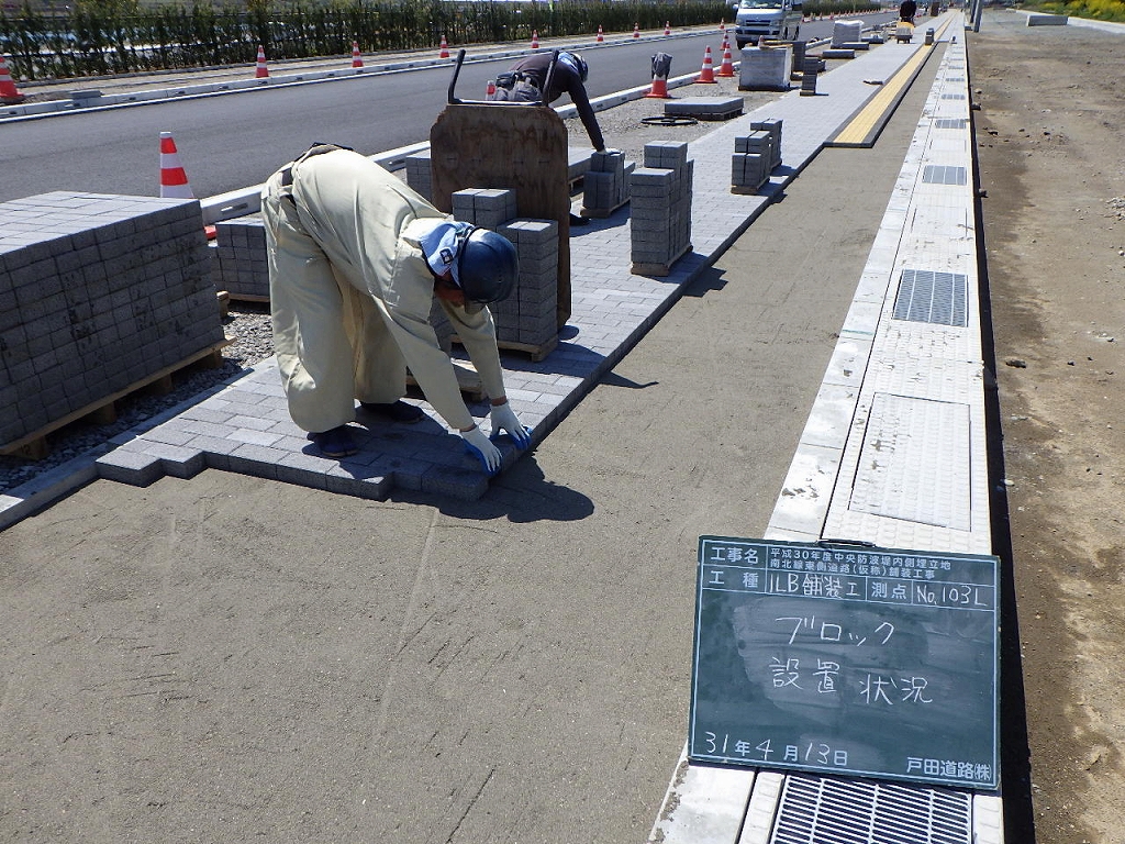本工事は2020東京オリムピックのボート競技とモトクロス競技の会場整備に伴う道路整備工事です。護岸工事や他のオリムピック施設工事で輻輳した状況での施工のため工程調整や資材搬入路の確保に苦労しました。施工延長1463mで主な工事内容は防護柵2,772m インターロッキング舗装6,104㎡ 歩道AS舗装6,420㎡ 車道舗装11,327㎡ です。