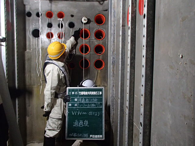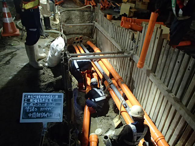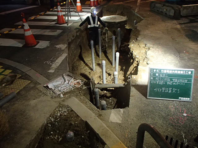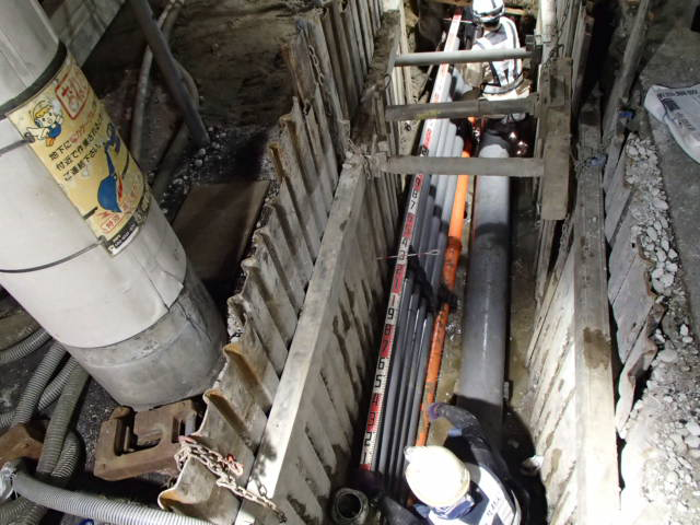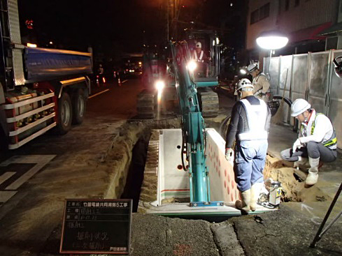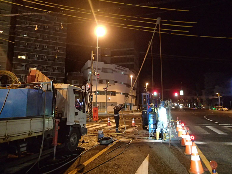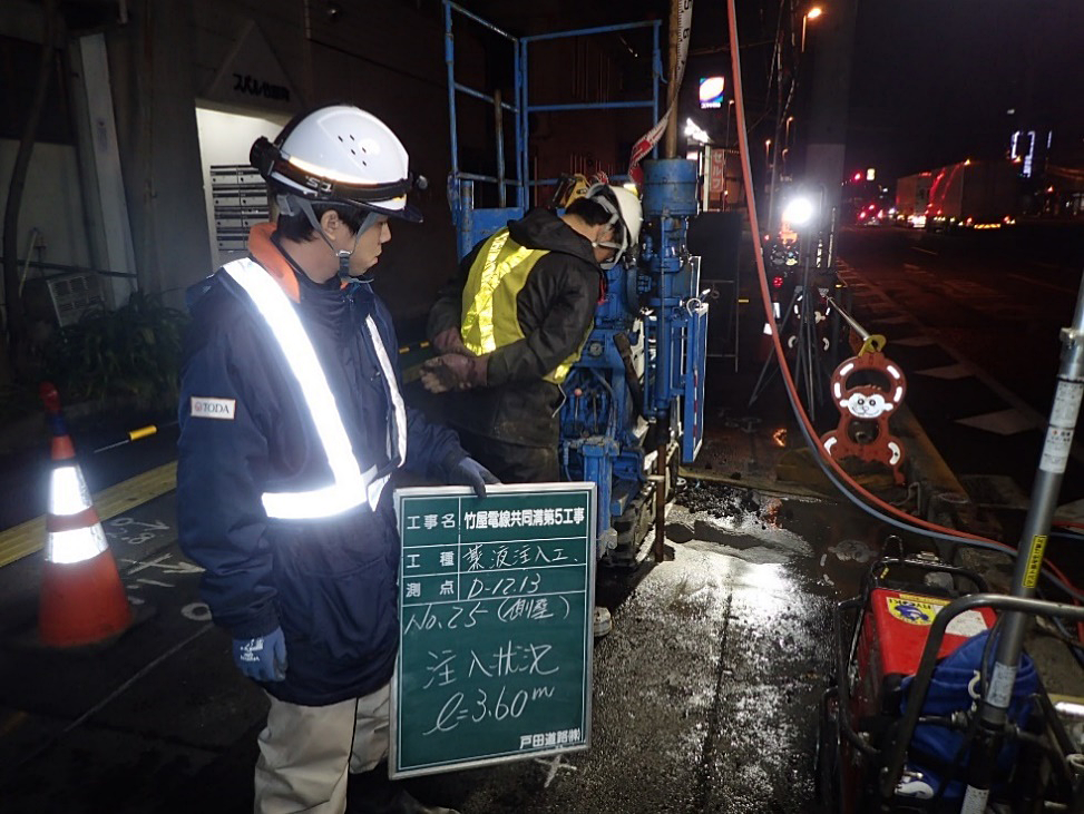 施工区間は地下水位が高く、特殊部及び管路工の一部で固結工(薬液注入工)の施工を行いました。施工条件として、夜間車線減少規制を実施しての施工でした。