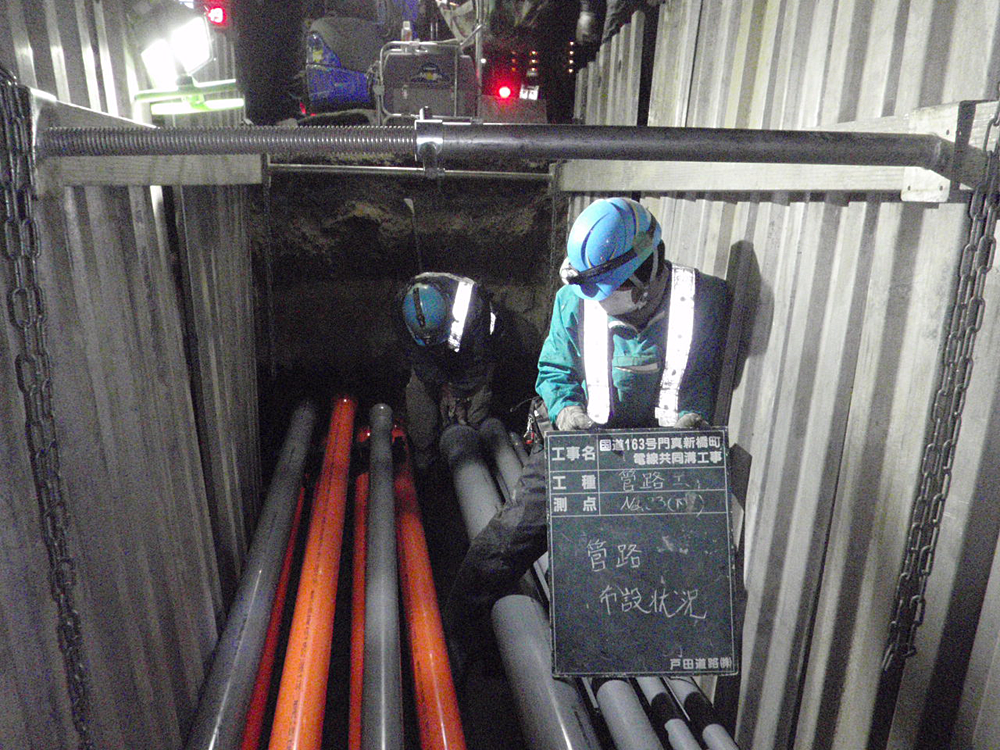 本工事は、一般国道163号の電線共同溝工事です。工事延長L=391m、電線共同溝管路延長L=8560mとなり、管路標準本数は30本でした。また、プレキャストボックス(特殊部)は車道部10箇所、歩道部11箇所、照明用桝4箇所の計25箇所に設置しました。