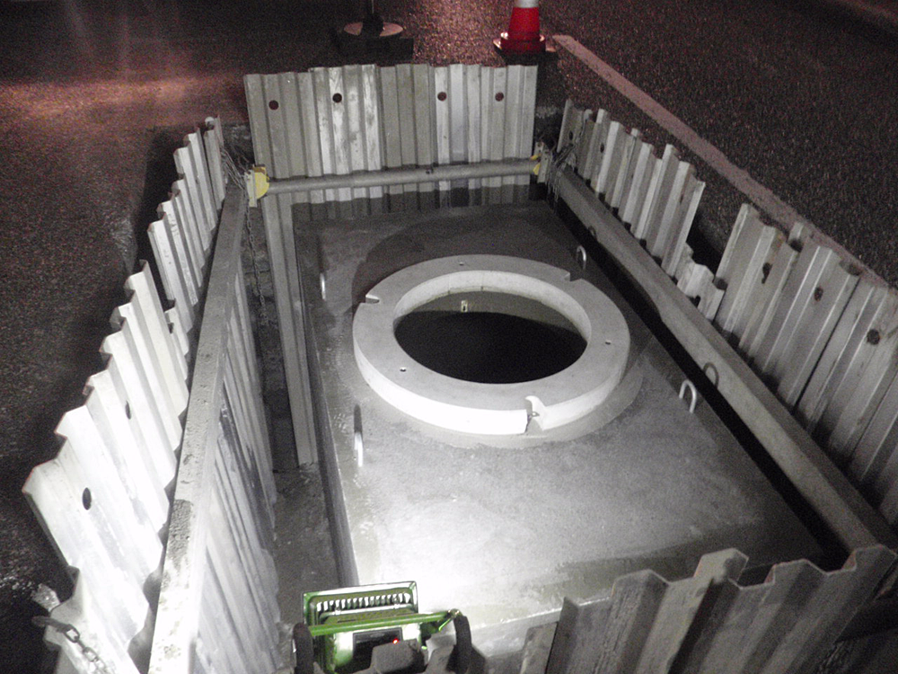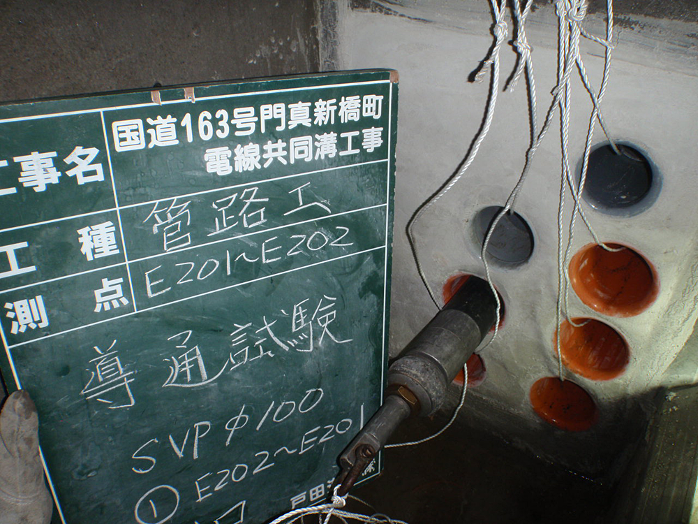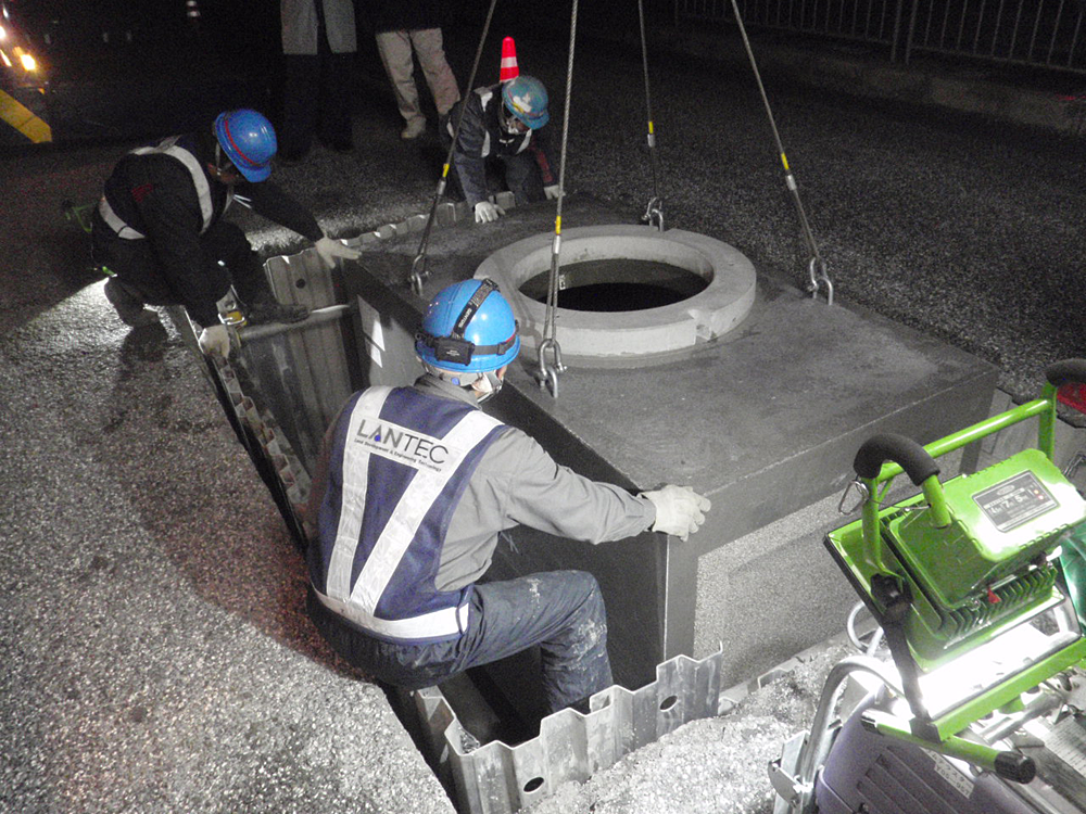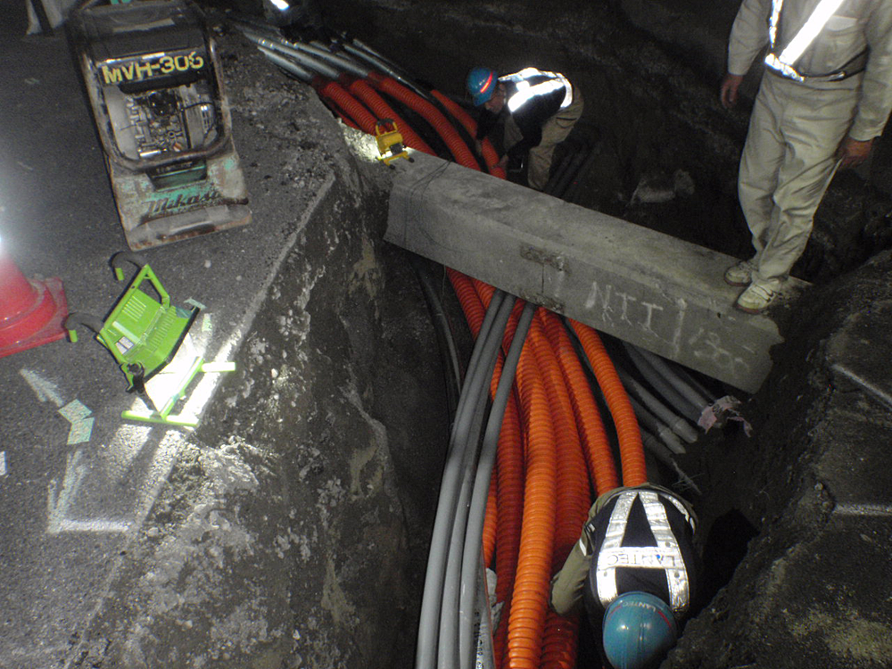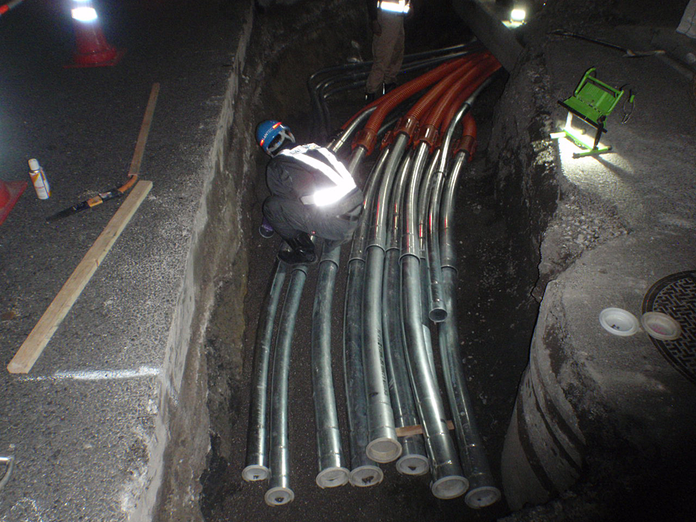 電線共同溝の管路工においては、幹線管路、道路境界までの引込管路、市道部の既設電柱の連系設備管路の施工でした。道路修繕として、舗装工、排水構造物工、縁石工、防護柵工、構造物撤去工もあり、施工は交通規制(主に1車線減少)による夜間21時〜翌6時までの間に行いました。