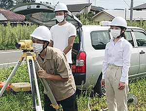 当日は、大学生3人に参加して頂き、自動追尾トータルステーションによる測量などを体験してもらいました。