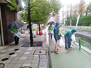 雨の中、多くの社員が参加して東京都発注の勝どき舗装現場周辺の清掃活動を行いました。
