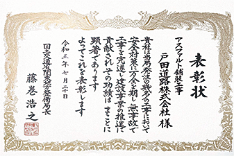 当社は国土交通省関東地方整備局発注工事のアスファルト舗装工事において無事故で幾多の工事を完遂した功績により安全管理優良受注者表彰を受けました。