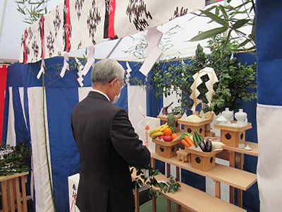 当日は、当地域の氏神様である和楽備神社の八幡大神をお招きし建物が無事に完成したことに感謝し、新しい建物を祓い清め、建物の永久堅固や繁栄を祈願しました。