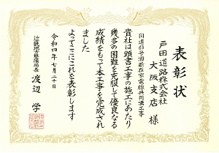 高度な品質を保持し、工程を守り 無事故無災害で竣工したことが評価され、近畿地方整備局長表彰を受けました。