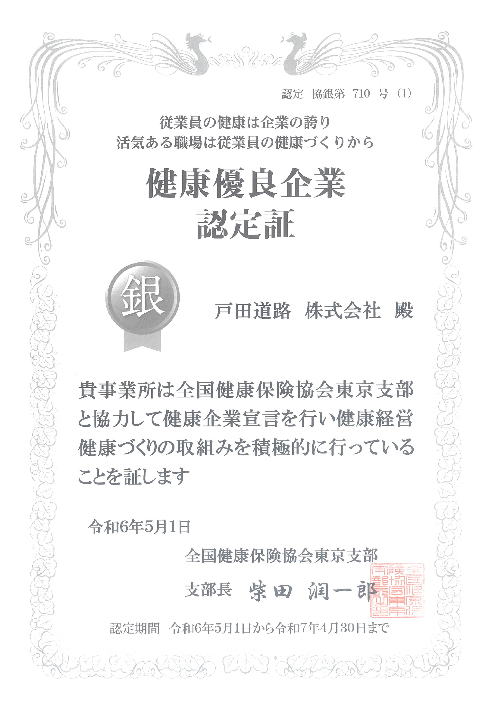 このたび戸田道路株式会社は、協会けんぽ東京支部が推進する「銀の認定2024」に認定されました。