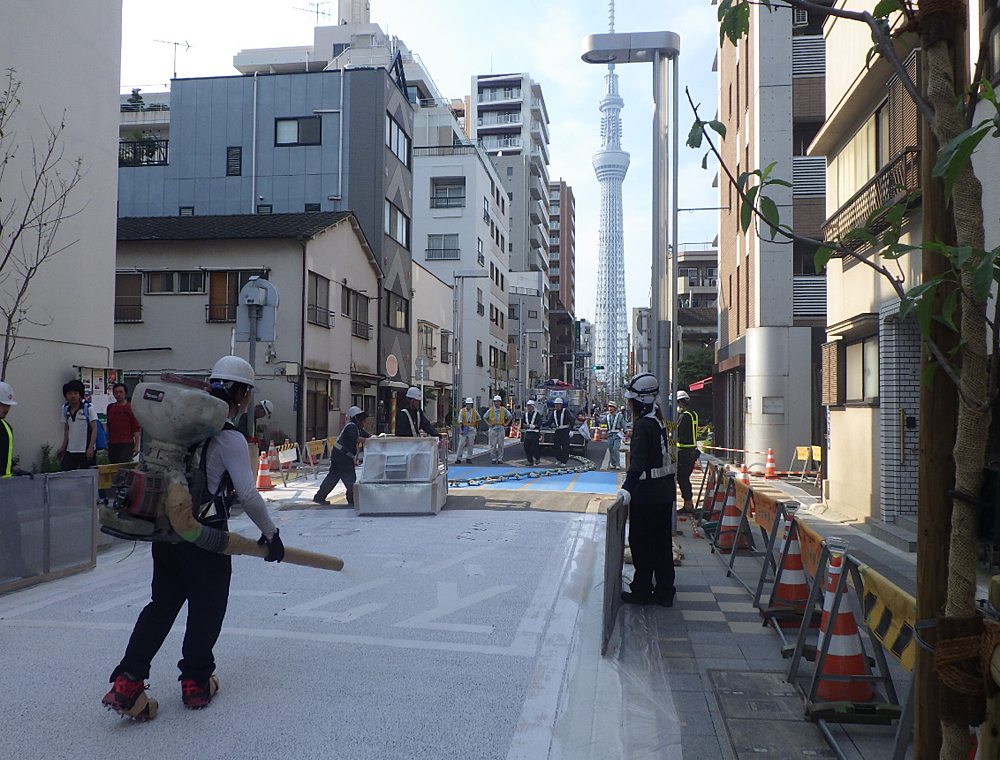 本工事は、東京都墨田区押上一丁目に聳え立つ東京スカイツリーから、真南のJR総武線錦糸町駅まで、ほぼ一直線の1本道が続く約1.2kmのタワービュー通りのうち、南端となる墨田区錦糸一丁目4番から同区太平二丁目8番までの延長370m区間を、戸田道路が担当しています。