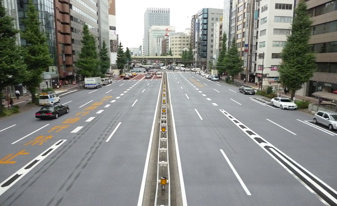 また、施工区間内にはマンションやオフィスビルが密集しており、パーキングメーターも多く設置されている箇所のため、通行車両だけでなく往来の歩行者、営業中の路面店舗などへの配慮にも、充分な注意喚起が必要でした。