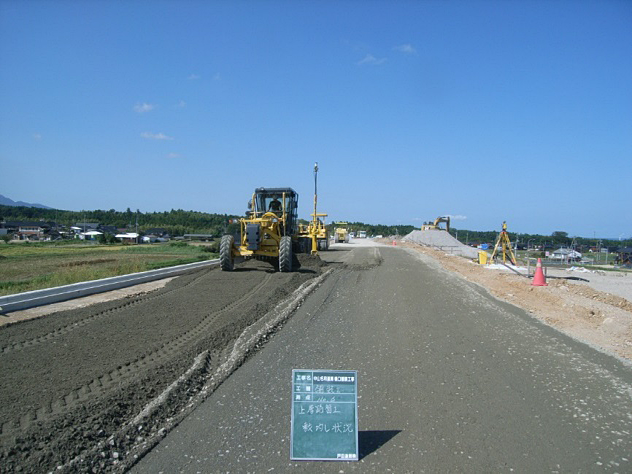 実際の施工に着手していく中、ICT施工で取り組む下層・上層路盤づくりにおいて、「TSを用いた出来形管理技術」により、GPSの各側点の座標値をもとに設計データを作成。そのデータ連携でTSから繰り出される位置情報による自動追尾機能を、モーターグレーダーの排土板の自動制御(上下)に活用して整地しました。「それまではモーターグレーダー1台に補助作業員が3人ついて、排土板などを操作していたものが、ICT施工では補助作業員1人で済みました。気を配って動かす箇所が減り、重機回りで動く人数が減って安全確保面でも効果的でした。ベテランのオペレーターさんも最初は半信半疑でしたが、施工後半には、こっちの方が早くきれいに仕上がっていいね!と上機嫌でしたよ」と伊藤も思い返します。