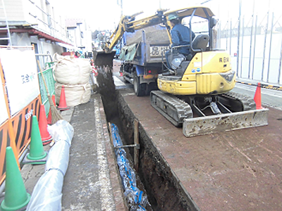 そこで戸田道路では、仮配管方式による配水小管布設替えの施工で本工事に臨みました。この工法のメリットは、施工前に仮の配管を設け、水の供給を確保しながら既設の古くなった水道管を取り替えていけること。従前のように、施工中、連日同じ時刻に1週間程度、断水を余儀なくされていた工法に比べ、30分程度の断水を2回お願いするだけで済むからです。