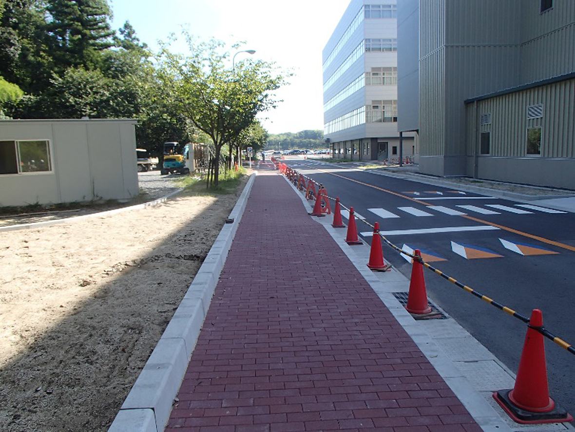 加えて、建築施工を進める戸田建設と並行しての作業となる中、そちらの関連車両をはじめ工期の調整、そして車道・歩道の舗装面を、新築される2棟の建物と合わせるため、現況より200mm下げる必要も生じていました。