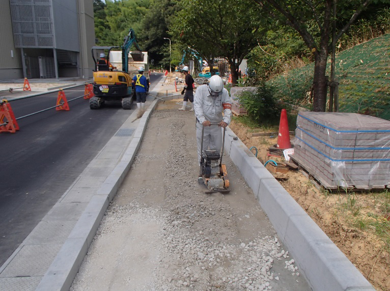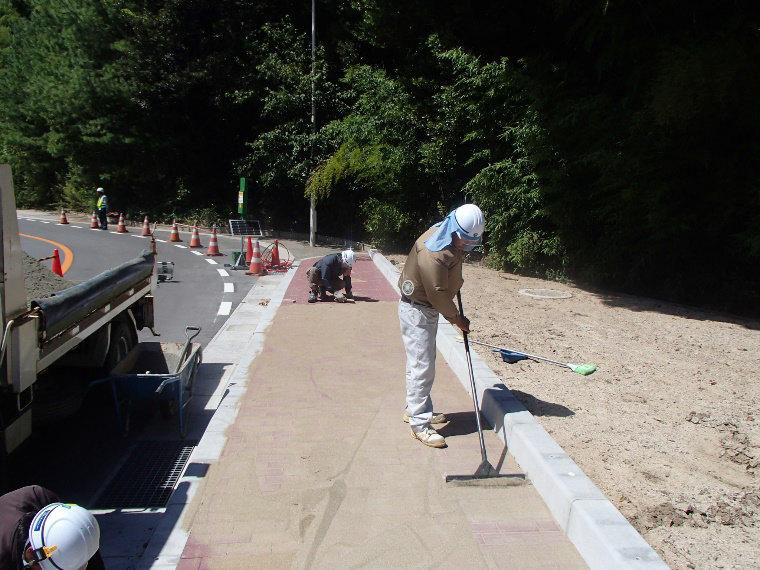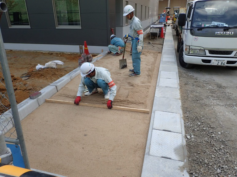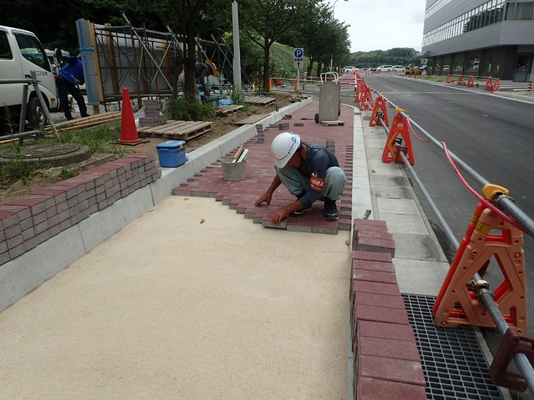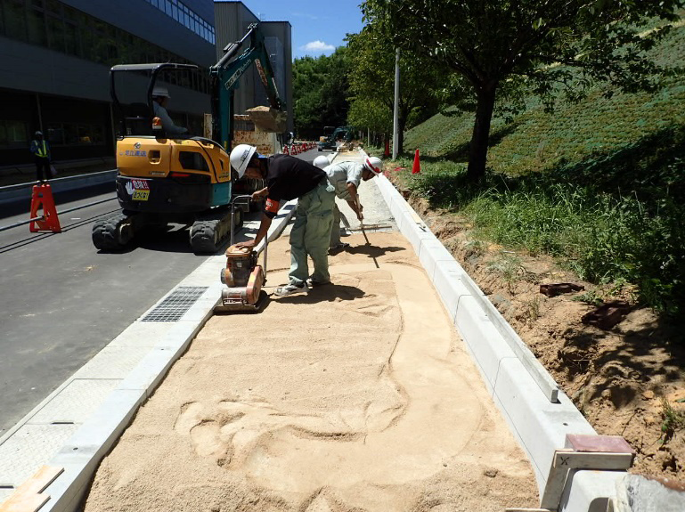 時間的な制約が厳しかったものの、春から初夏にかけての工期を、無事、遅延や事故もなく終えた本工事。完工・引渡しの前に確認をとったところ、狙い通りに目地砂が硬くなり、沈下やズレも生じず、きれいな仕上がりで納めることができました。その後、目地砂が硬くなったことで、以前のように雑草が生えなくなり、発注者からたいへん喜ばれることになった、というおまけ話もついています。
