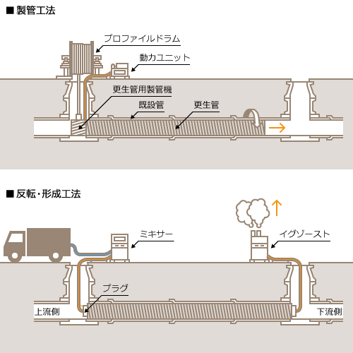 代表的な「内面被覆工法」の技術に、反転・形成工法と製管工法があります。戸田道路ではどちらにも対応可能です。反転・形成工法は、損傷した既設の下水道管きょ内部に、強靭で平滑なFRPパイプを構築する非開削管きょ更生工法です。製管工法は、既設管の内側に塩ビ製の更生管をつくり、それの間隙に特殊裏込め材を充填しながら進んでいく自走式製管機を用いた更生工法です。