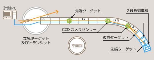発信立坑より泥濃式曲線掘進機をプリズム(光波)または、電磁波を用いて位置を確認しながら推進している状況を平面的に解説